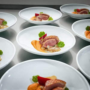 Relaxed and understated, Schonwald Shiro features sturdy edges, deep coupes and distinctive contours. Ideal for modern dining settings, its classic colour enhances stunning food presentations.